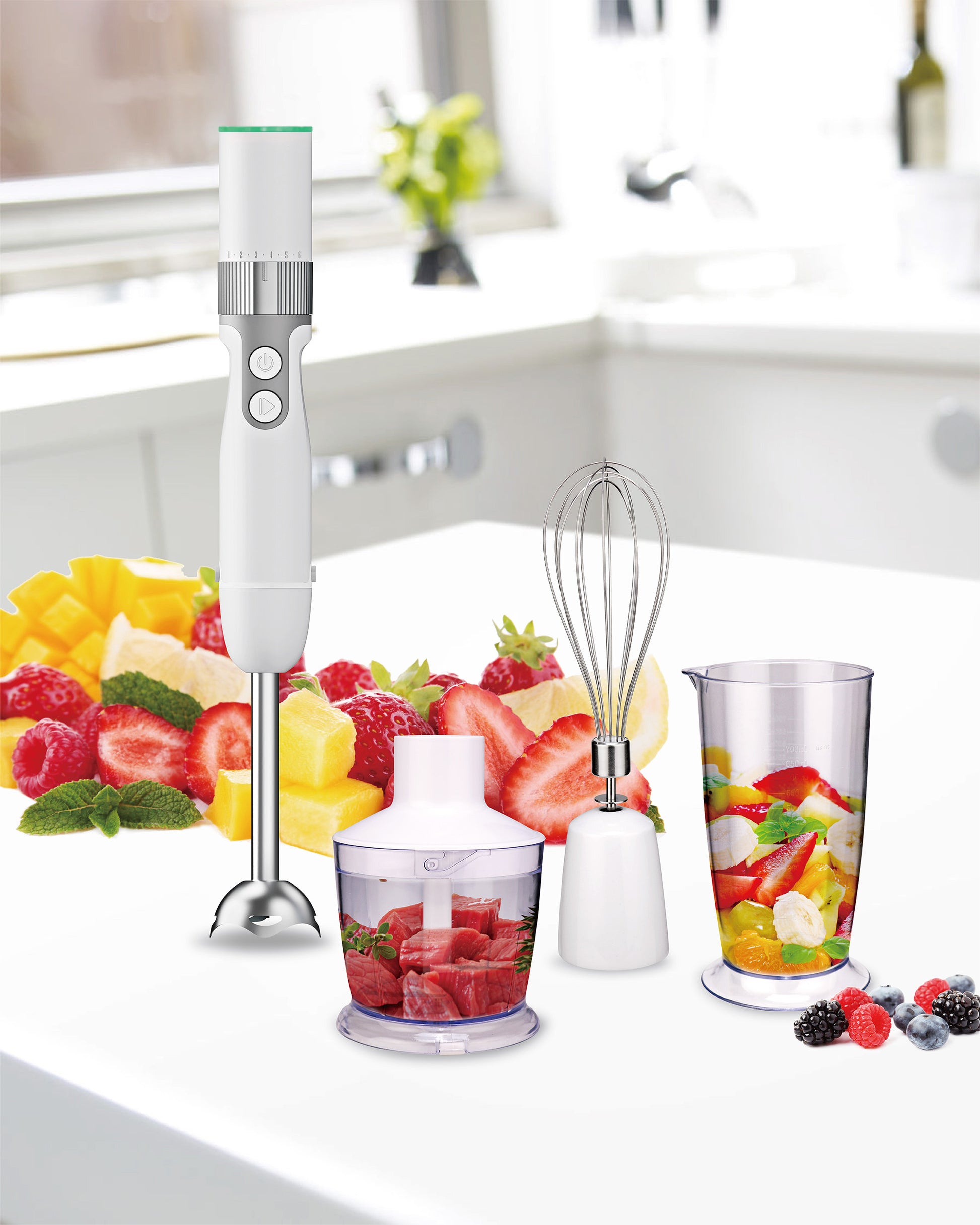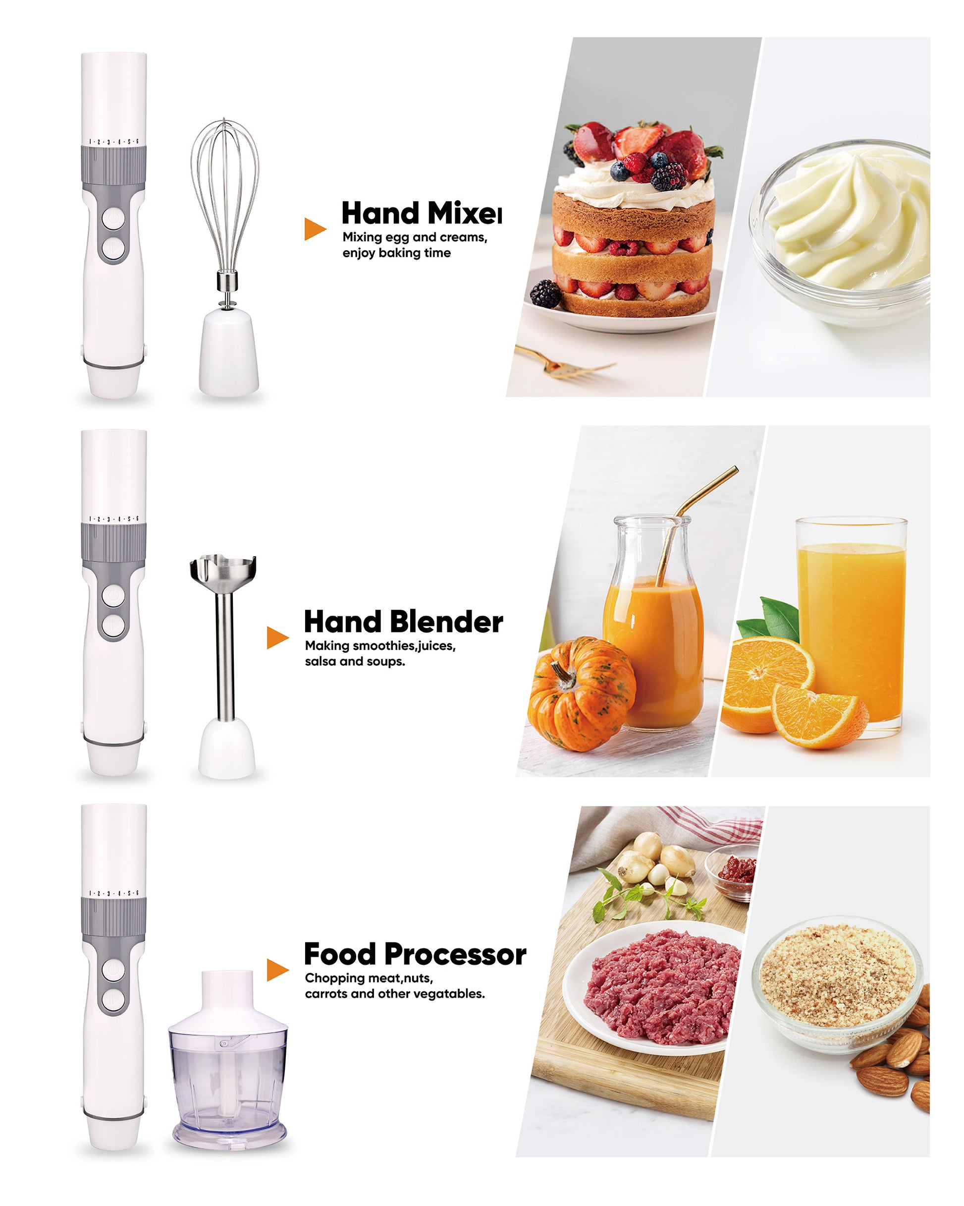 - Multi-functional Immersion Blender: Features 6 adjustable speeds and comes with a 700ml chopper, 700ml beaker, and egg whisk. Perfect for smoothies, soups, and baby food.