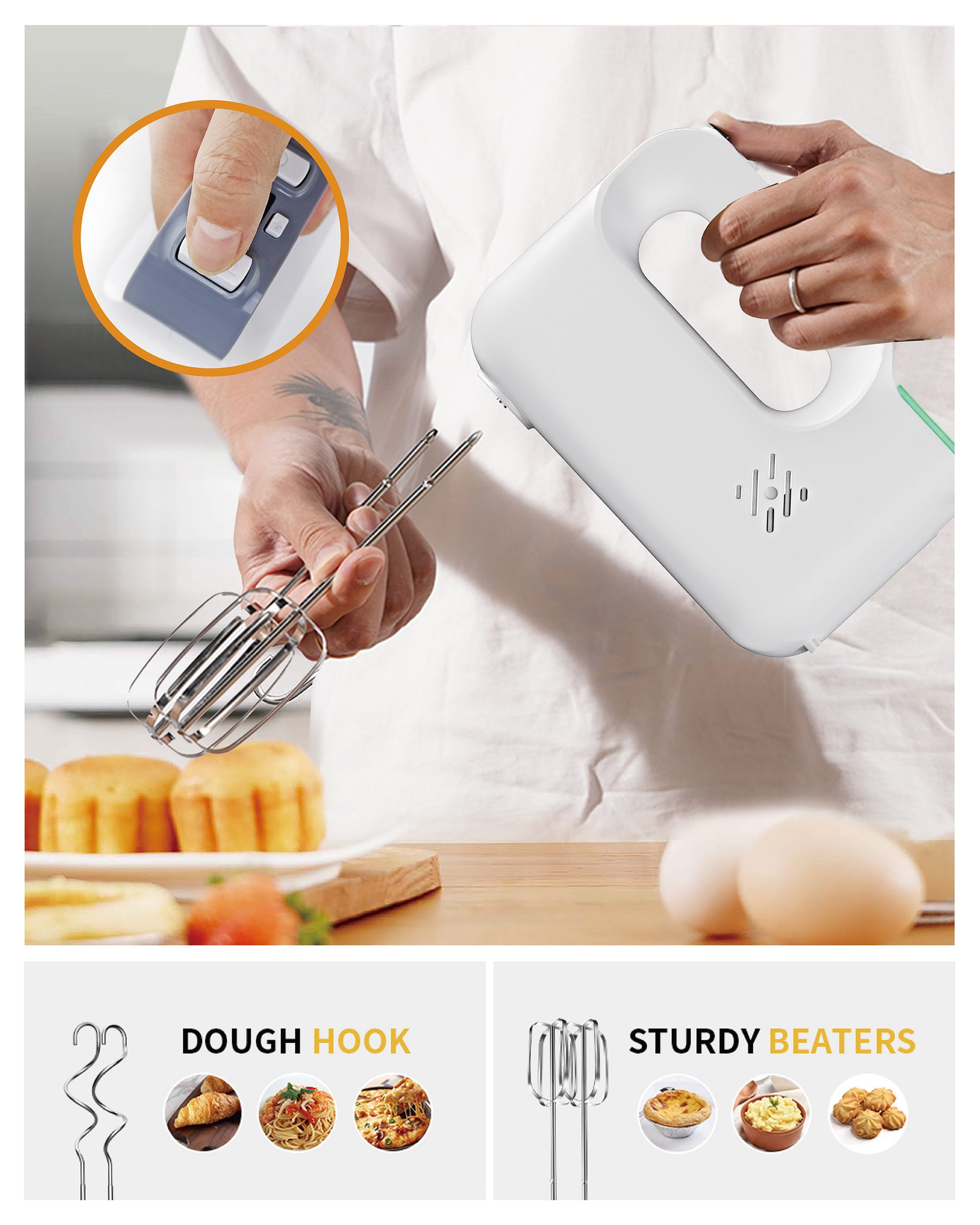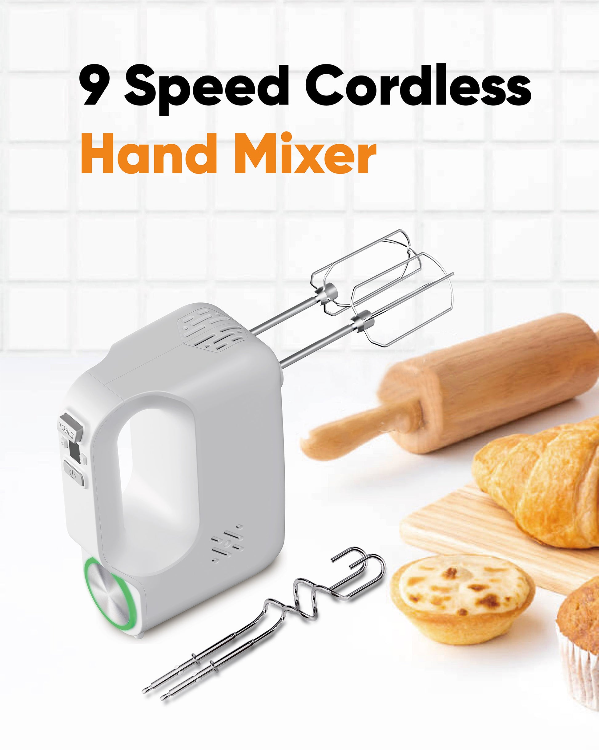 - 9-Speed Electric Hand Mixer: Equipped with beater and egg whisk. 9 adjustable speeds. Easily handles bread, cookies, cakes.